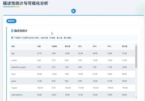 描述性统计与可视化分析界面是球员数据分析项目中的一个重要组成部分,它包含了多个功能模块来帮助用户深入了解球员数据。首先,数据预处理模块负责处理原始数据,包括清洗、转换和合并数据集,以确保后续分析的准确性。其次,描述性统计模块提供了关于球员特征的详细统计数据,使用户能够快速了解数据的分布情况。接着,可视化分析模块通过各种图表形式将复杂的数值数据转化为直观的可视化图形,便于用户发现数据间的关联性和潜在的模式。然后,回归模型模块利用线性回归或对球员数据进行建模,以预测球员的表现或价值。最后,决策树模块通过构建决策树模型来识别影响球员身价的关键因素,并为用户提供决策支持。描述性统计界面如图5-2、5-3所示:
