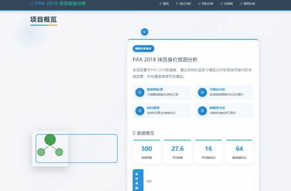 球员数据分析项目概览界面实现了多个关键功能模块,每个模块都旨在帮助用户更好地理解和预测球员身价。首先,数据预处理模块负责大规模数据的清洗与特征工程,确保输入数据的准确性和可靠性。接下来,可视化分析模块提供了多维度的数据图表与交互式展示,使用户能够直观地洞察数据背后的模式和趋势。回归模型模块则采用了多种回归算法与参数优化技术,用于建立精确的球员身价预测模型。此外,树模型分析模块通过决策树与集成学习方法,进一步提升了预测模型的性能和准确性。最后,模型比较模块允许用户对不同预测模型的性能进行比较,以便选择最合适的模型进行实际应用。这些功能模块相互配合,共同构成了一个强大的球员身价预测与分析平台,为用户提供了全方位的数据支持和决策依据。项目概览界面如图5-1所示: