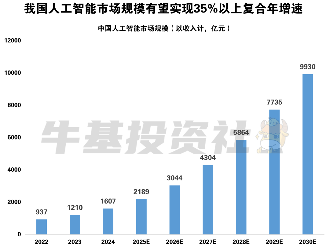 从市场规模角度看,国内AI产业整体保持高增速。中国AI市场规模由2022年的937亿元增至2024年的1607亿元,2022年至2024年复合年增长率为31%;预计2030年,中国AI市场规模将进一步增至9930亿元,2024年至2030年的复合年增长率为35.5%,进一步加速。