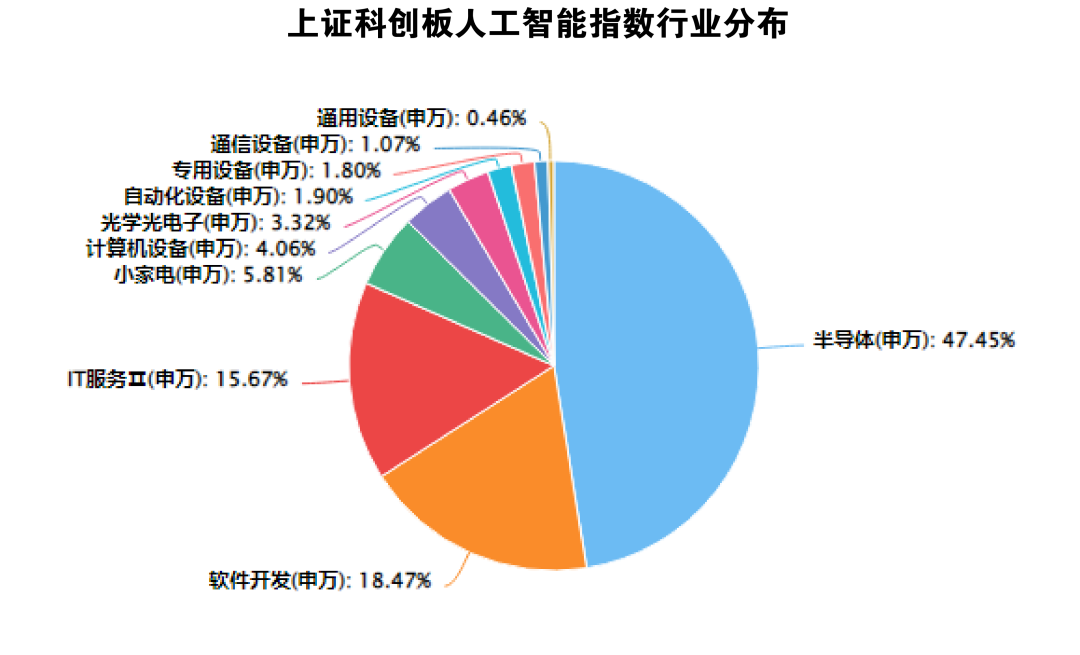 从行业分布来看,上证科创板人工智能指数的行业结构呈现鲜明的“半导体主导”特征。根据申万二级行业分类标准,指数中半导体相关企业的权重占比高达47.45%,成为绝对核心板块;其次为软件开发(18.47%)与IT服务(15.67%),三大板块合计权重超 80%,行业聚焦度较高,充分贴合人工智能产业对核心硬件与软件服务的需求导向。