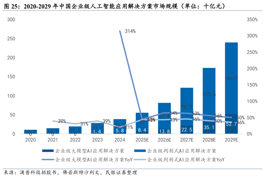 以AI Agent为代表的新型应用形态,开始在办公、金融、编程、政务等场景中实现更深度的使用,从“辅助建议”走向“部分任务替代”。根据佛若斯特沙利文的测算,按收入计,中国企业级人工智能应用解决方案市场规模已经从2020年的人民币107亿元增长到2024年的386亿元,并有望在未来几年保持较快增长。