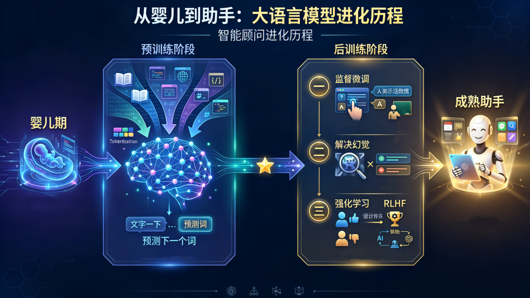 今天,我们就掀开这层神秘面纱,带你走通大语言模型的“一生”——从诞生于海量数据的“婴儿”,到成为能与你侃侃而谈的“助手”。理解了这个流程,你将不再把它当作一个“黑箱”,而是能像老司机一样,预判它的反应,更高效地“驾驭”它。