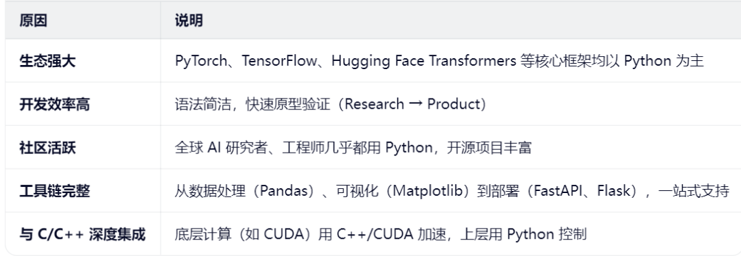 Python 是构建、训练、部署和应用 AI 大模型的“通用语言”和核心工具链。