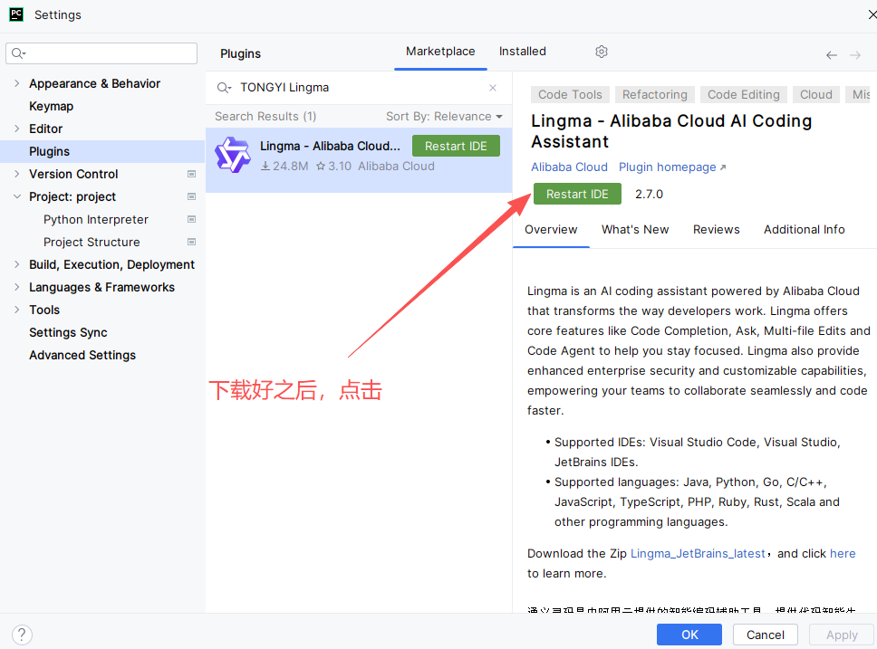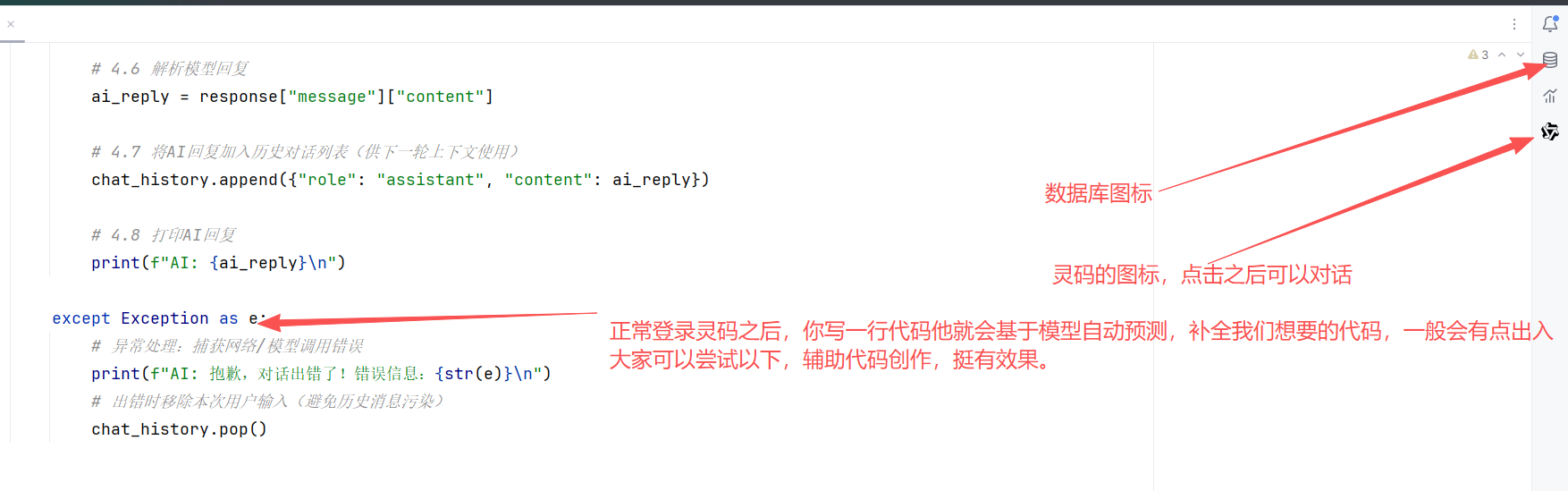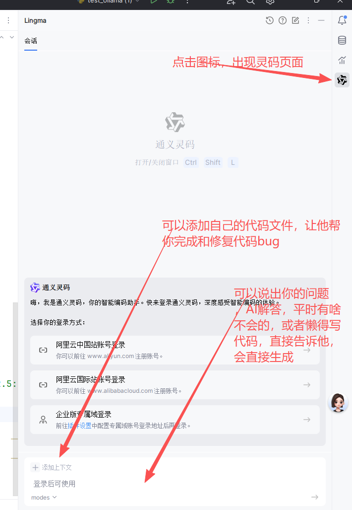 ③ 安装完成后重启PyCharm,右侧会出现通义灵码标签页。