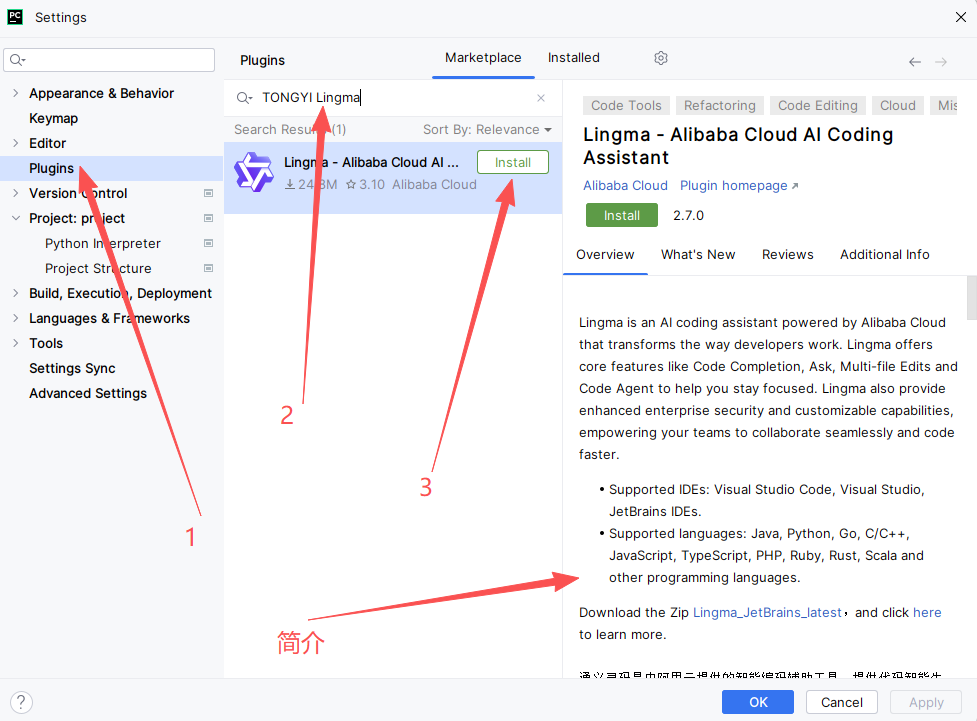 ② 在搜索框输入「TONGYI Lingma」,找到阿里云官方插件点击 Install;