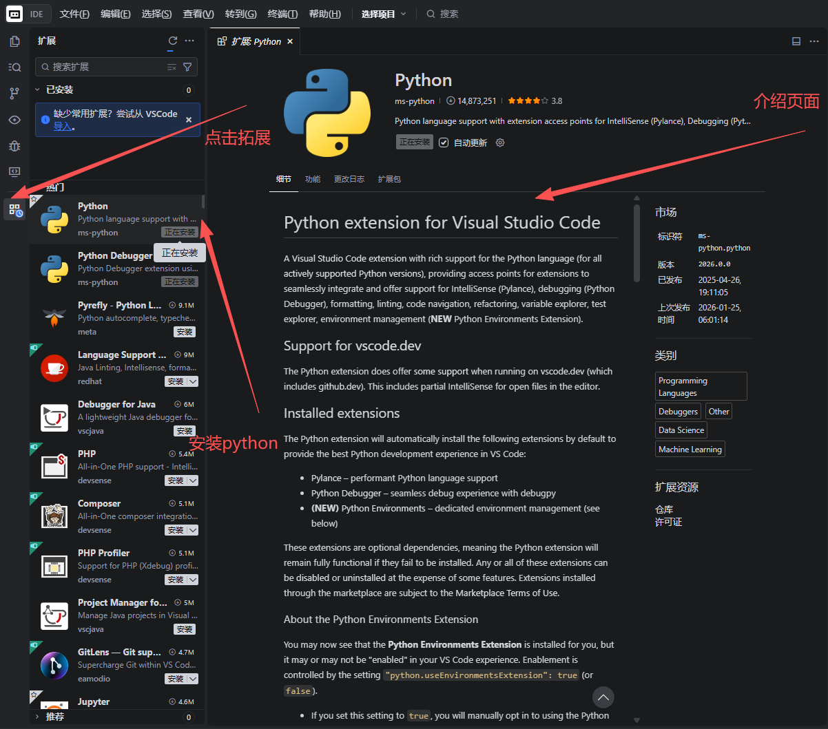 一定要安装python插件,成功之后需要重启应用,有的就不需要安装了。