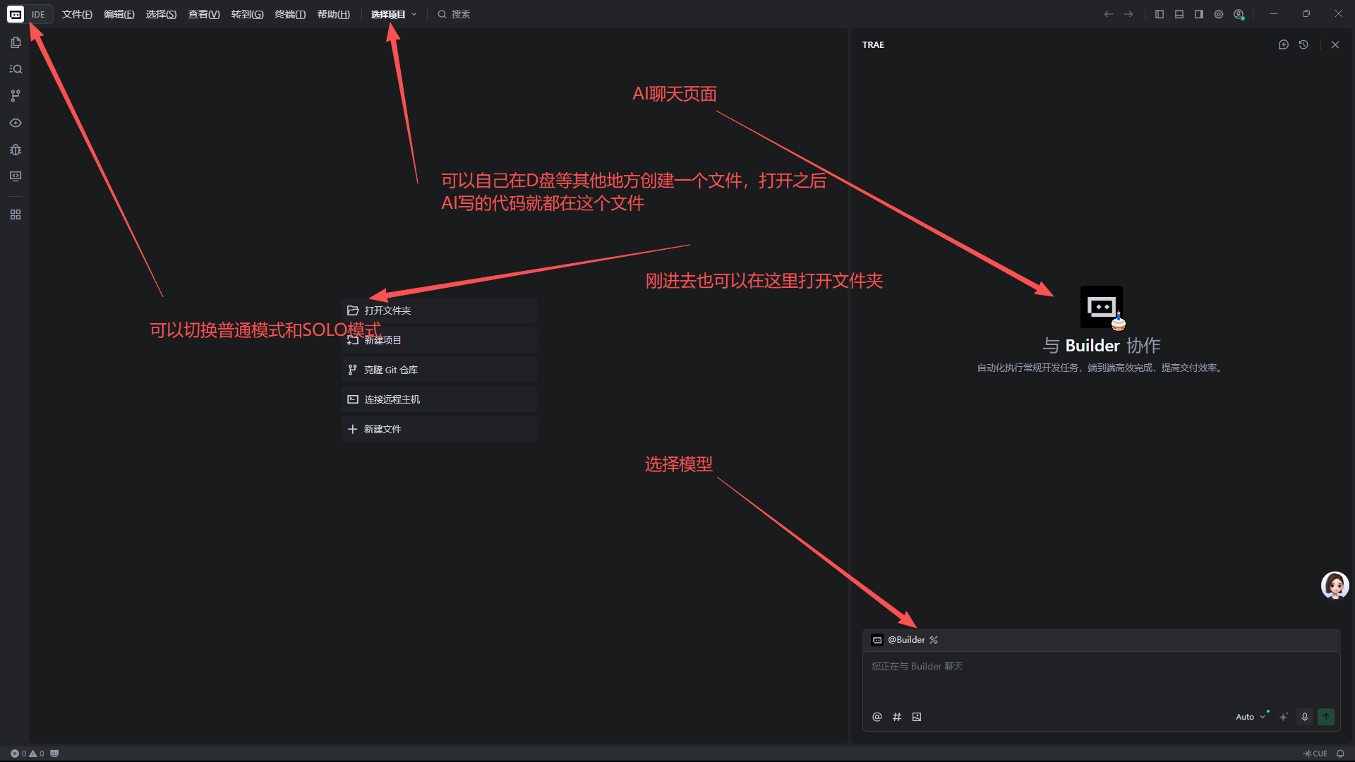 builder 功能是面向项目从 0 到 1 搭建的智能构建模块,主打快速原型生成与基础项目骨架搭建,与聚焦复杂项目迭代的 SOLO Coder 形成功能互补。该功能内置主流技术栈的模板库,涵盖前后端分离项目、单页应用、接口服务等多种开发场景,开发者只需选择目标技术栈、配置核心项目参数(如项目名称、依赖版本、目录结构),builder 就能一键生成可直接运行的基础项目代码,包含初始化配置文件、核心功能模块框架及基础测试用例;同时支持可视化调整项目结构与依赖项,降低项目初始化的繁琐程度,特别适合快速验证产品原型、搭建小型应用或完成项目基础框架的快速落地。