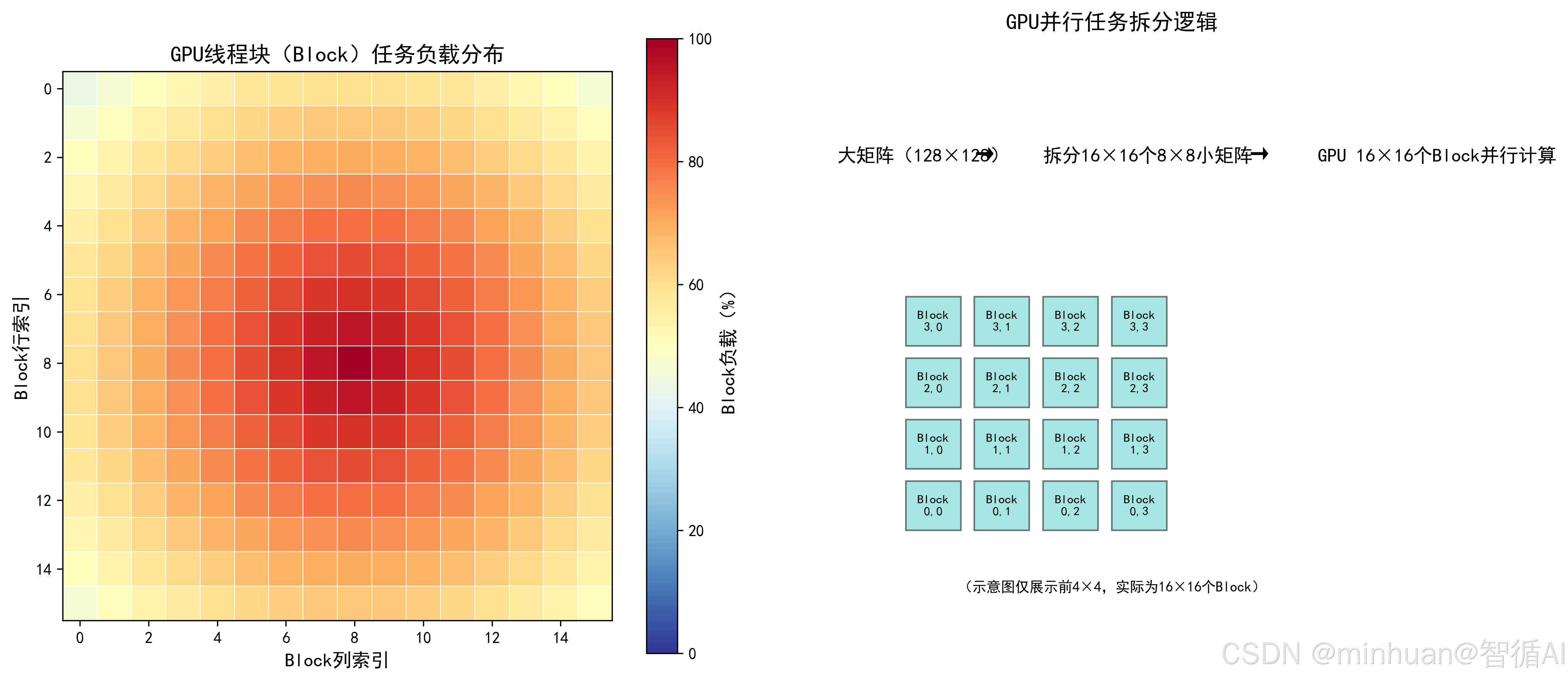 用热力图展示“GPU 线程块(Block)× 线程(Thread)”的并行任务分配,直观看到大任务如何拆成小任务,分给不同 GPU 核心。