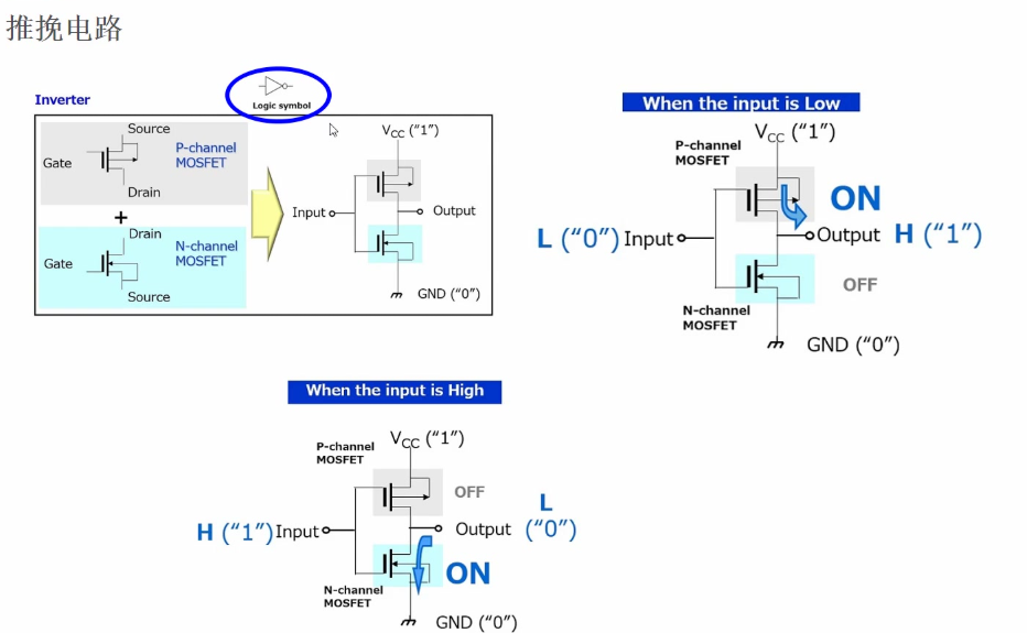 - 此结构即为 互补 MOS(CMOS)反相器,也是最基础的推挽输出单元。