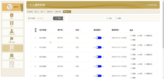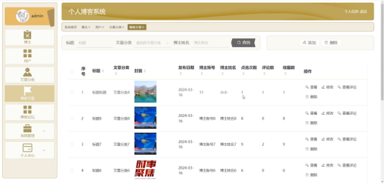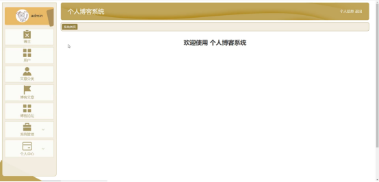 管理员进入主页面,主要功能包括对用户、博主、文章分类、博客文章、博客论坛、系统管理、个人中心等进行操作。管理员主页面如图5-8所示:
