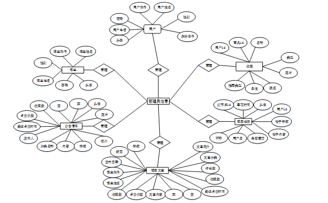 概念模型是对现实中的问题出现的事物的进行描述,ER图是由实体线以及关联构成的图,E-R图可以明确地叙述系统中涵盖的实体线相互关系。将“用户、博主、博客文章、公告信息、博客论坛、收藏”等作为实体,它们的局部E-R图,如图4-2所示: