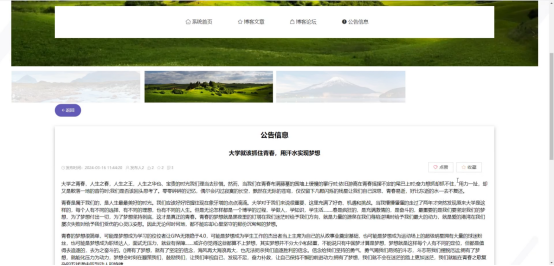 公告信息:在公告信息页面的输入栏中输入标题进行查询,可以查看到公告详细信息,并根据需要进行点赞或收藏等操作。公告信息页面如图5-4所示:
