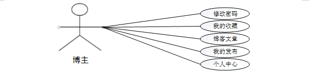 博主登录系统所涉及到的功能主要有个人中心、修改密码、博客文章、我的发布、我的收藏等功能。博主用例如图3-2所示。