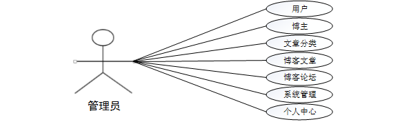 管理员登录系统所涉及到的功能主要有用户、博主、文章分类、博客文章、博客论坛、系统管理、个人中心等功能。管理员用例如图3-1所示。