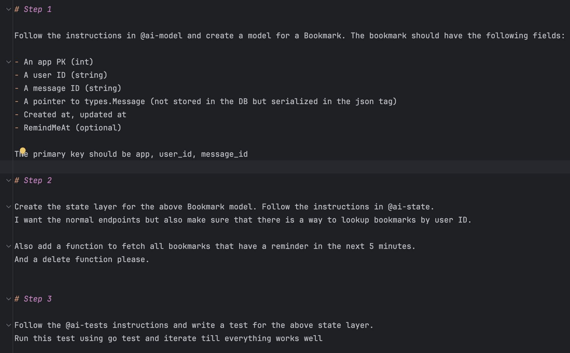 对于复杂功能(比如“消息收藏”),别直接让 AI 开干。先写一份 项目计划文件(Project File):