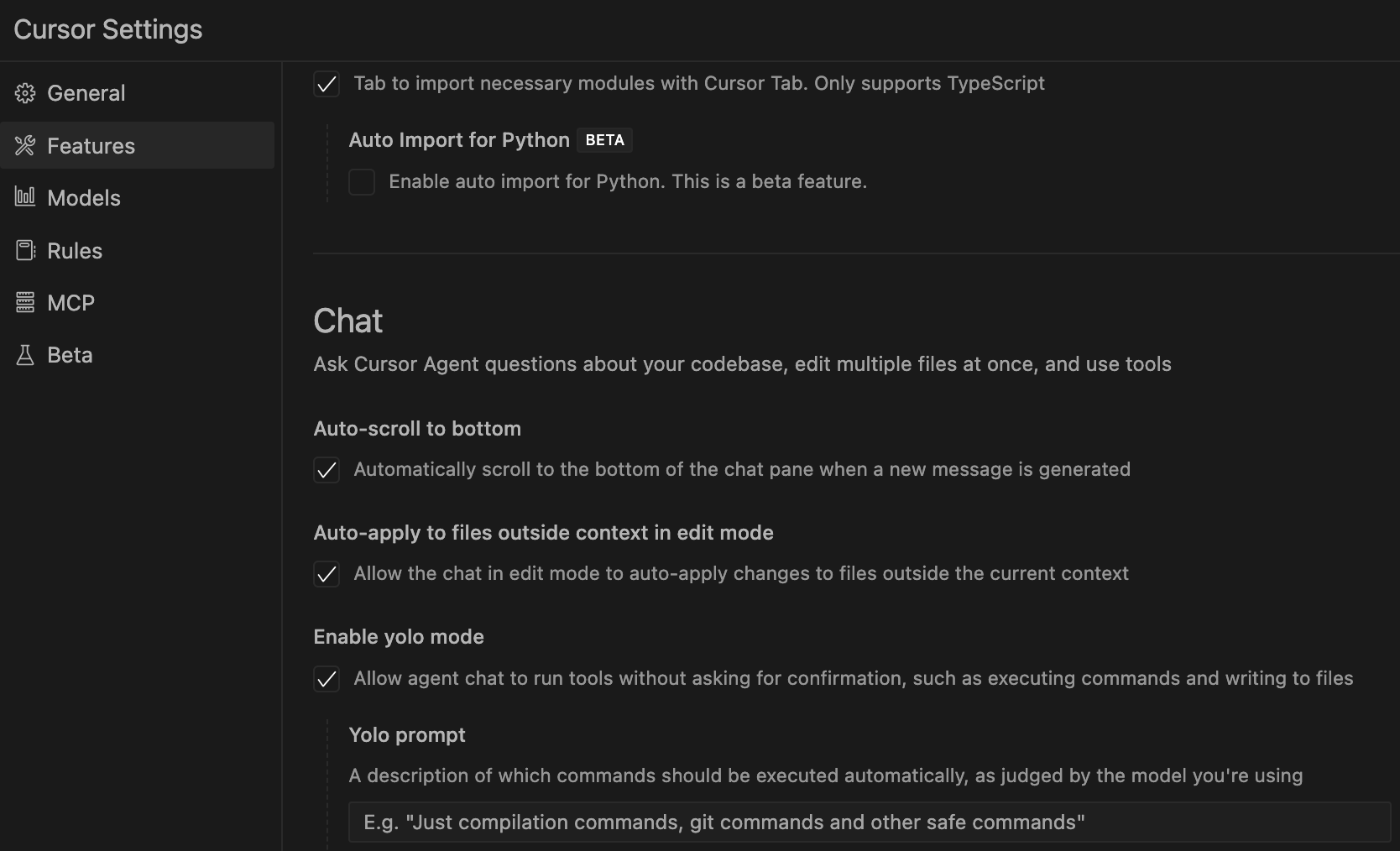 在 Cursor 设置中开启 YOLO 模式,允许 AI 自动运行测试,无需手动确认。