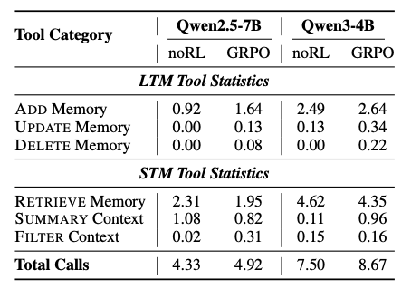 上表统计了 RL 训练前后,Agent 调用各类记忆工具的平均次数。可以发现,经过 RL 训练(GRPO)后,Agent 调用 LTM 工具(特别是 ADD 和 UPDATE)的频率大幅增加。这说明,Agent 变得更“主动”地去构建和维护自己的知识库了,而不是被动地接收信息。同时,FILTER 工具的使用也增多了,表明 Agent 学会了更积极地清理上下文噪声。