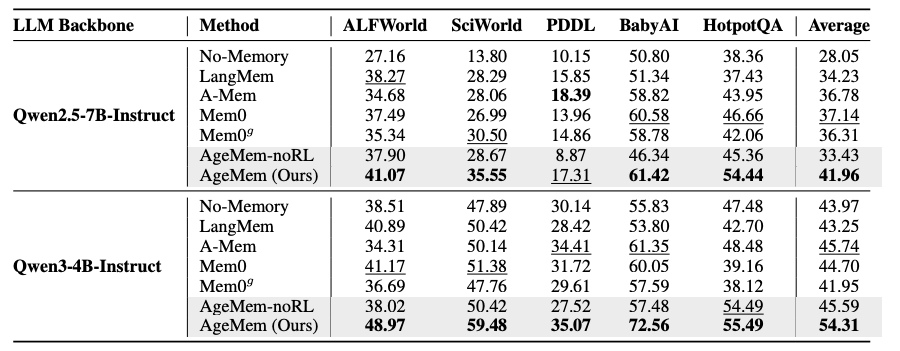 俗话说“是骡子是马,拉出来遛遛”。AgeMem 的效果到底如何?作者在一系列复杂的长程推理任务上,把它和当前最主流的几个记忆增强方法(如 LangMem, A-Mem, Mem0 等)进行了全方位对比。