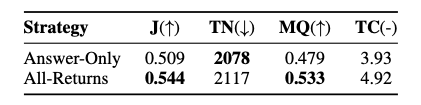 结果非常明显,All-Returns 策略(也就是 AgeMem 使用的策略)不仅收敛得更快,最终达到的平均奖励也更高。在下方的表格中,可以看到 All-Returns 在任务性能(J)和记忆质量(MQ)上都显著优于 Answer-Only 策略。这说明,通过在奖励中明确地引导模型关注记忆管理过程,确实能让它学到更聪明的记忆策略。