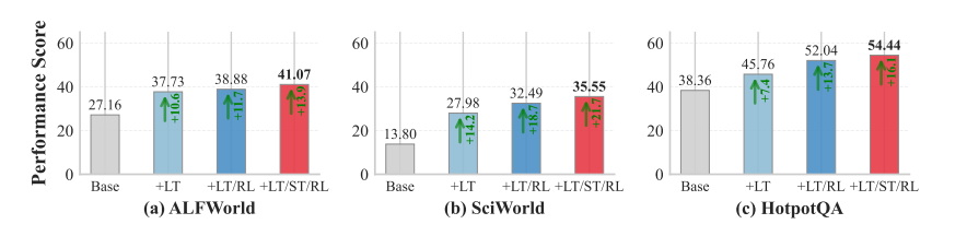 上图的消融实验完美地证明了这个三阶段策略的有效性。可以看到,在三个不同的数据集上(ALFWorld, SciWorld, HotpotQA),每增加一个模块(+LT 表示只加 LTM,+LT/RL 表示增加 LTM 和强化学习,+LT/ST/RL 表示完整的 AgeMem),模型的性能都有显著的提升。这说明 LTM、STM 和强化学习这三个组件,缺一不可,而且组合在一起能发挥出 1+1+1 > 3 的效果。