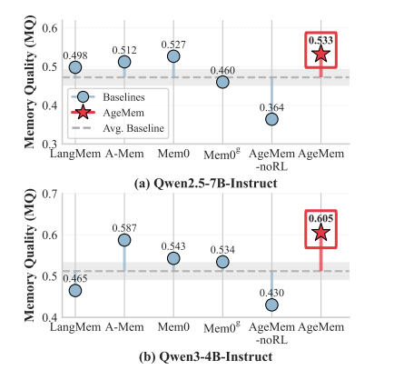 结果如图所示,AgeMem 在内存质量(Memory Quality, MQ)这个指标上同样是一骑绝尘。MQ 分数越高,意味着 Agent 存储到 LTM 里的信息和解决问题所需的事实(ground-truth facts)关联性越强。这说明 AgeMem 不仅任务完成得好,而且它构建的长期记忆知识库也是最精准、最高效的。