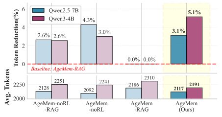 上图对比了使用 STM 工具的 AgeMem 和使用传统 RAG 来管理上下文的 AgeMem-RAG 变体。结果显示,完整的 AgeMem 在两个模型上都显著降低了平均 Token 消耗,最高减少了 5.1%。别小看这 5%,在动辄万级 Token 的长程任务中,这能节省下相当可观的成本。