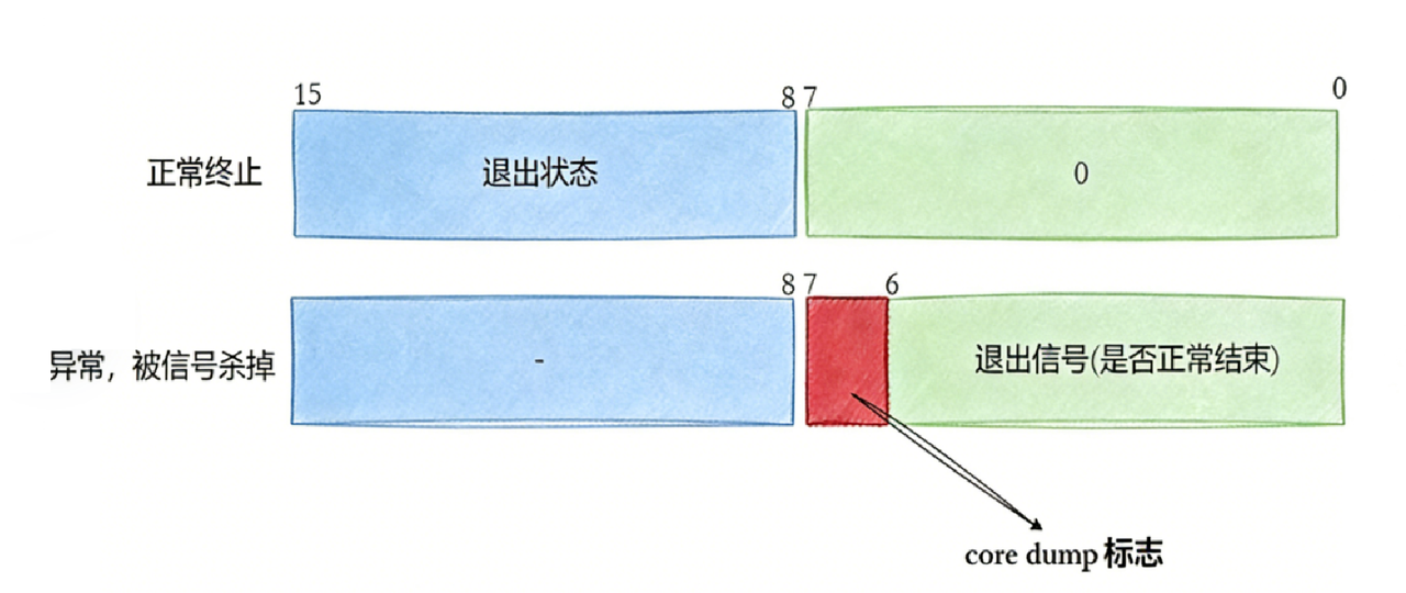 printf("exit signal: %d, core dump: %d\n", status&0x7F, (status>>7)&1);