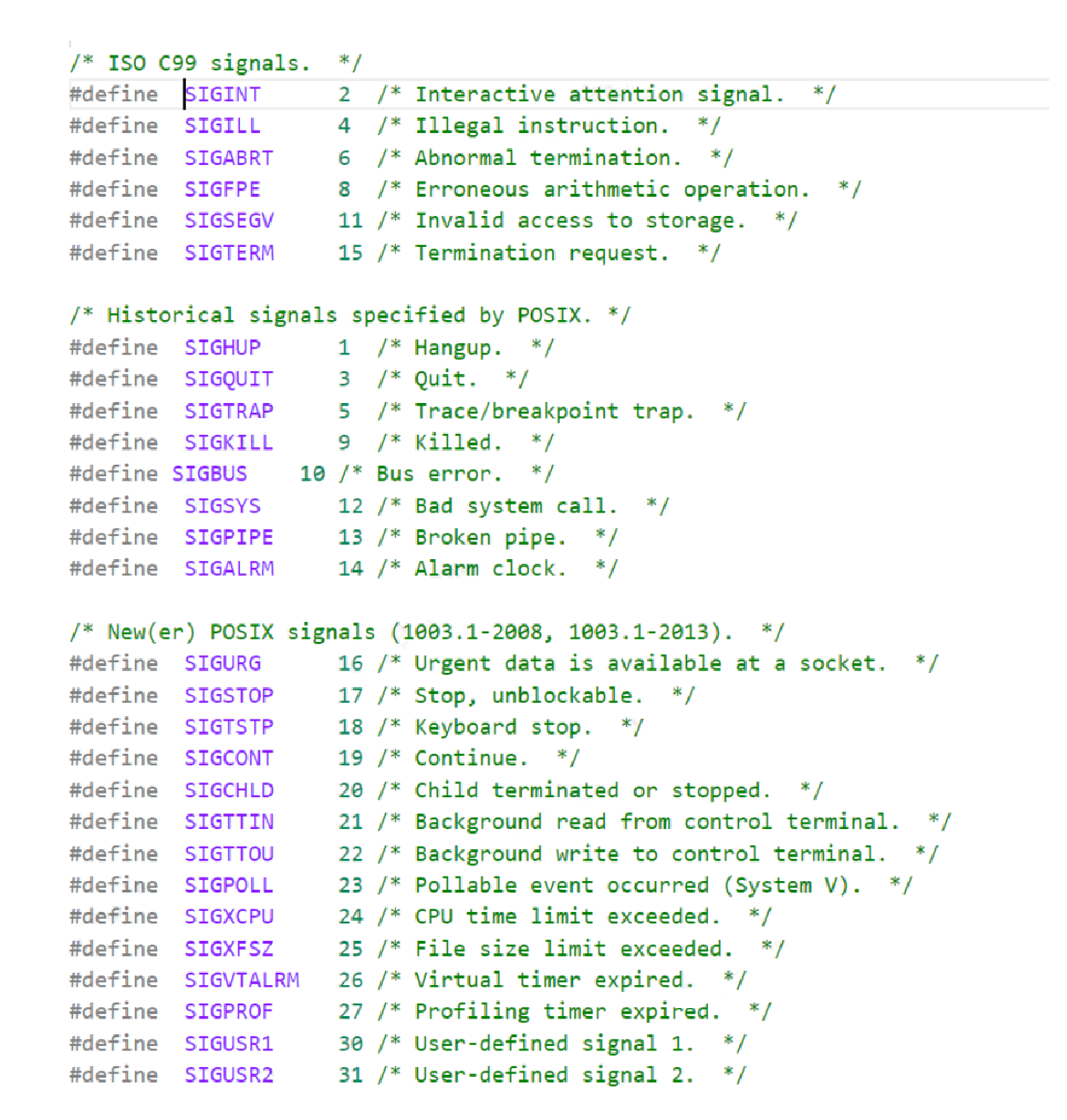 每个信号都有一个编号和一个宏定义名称,这些宏定义可以在signal.h中找到,例如其中有定义