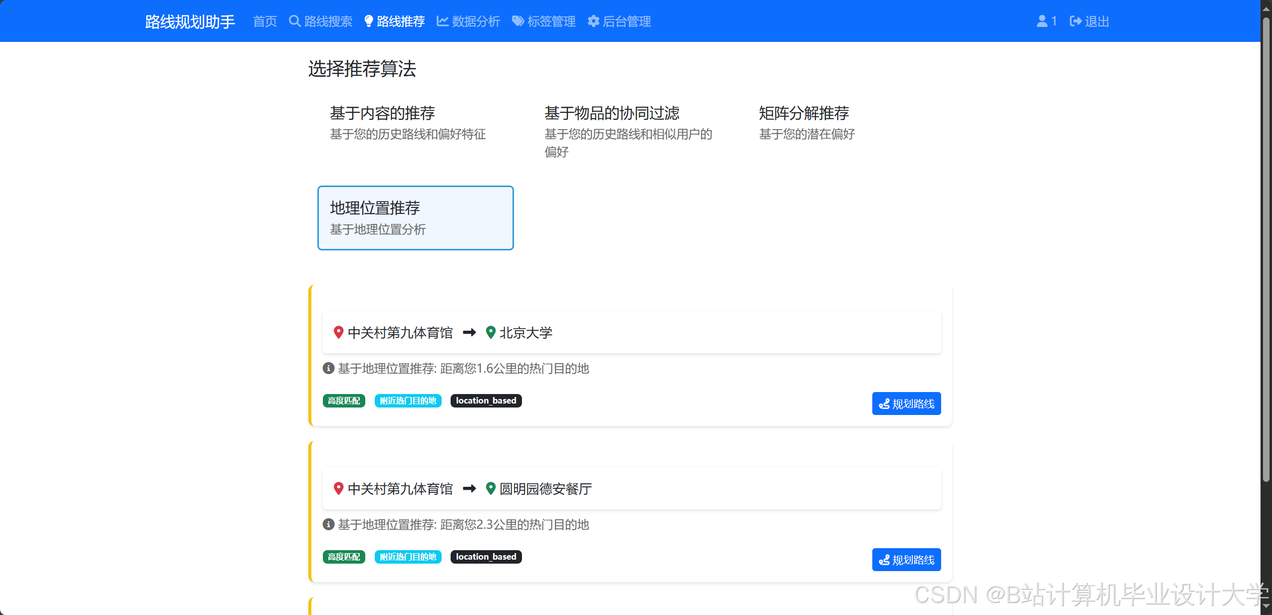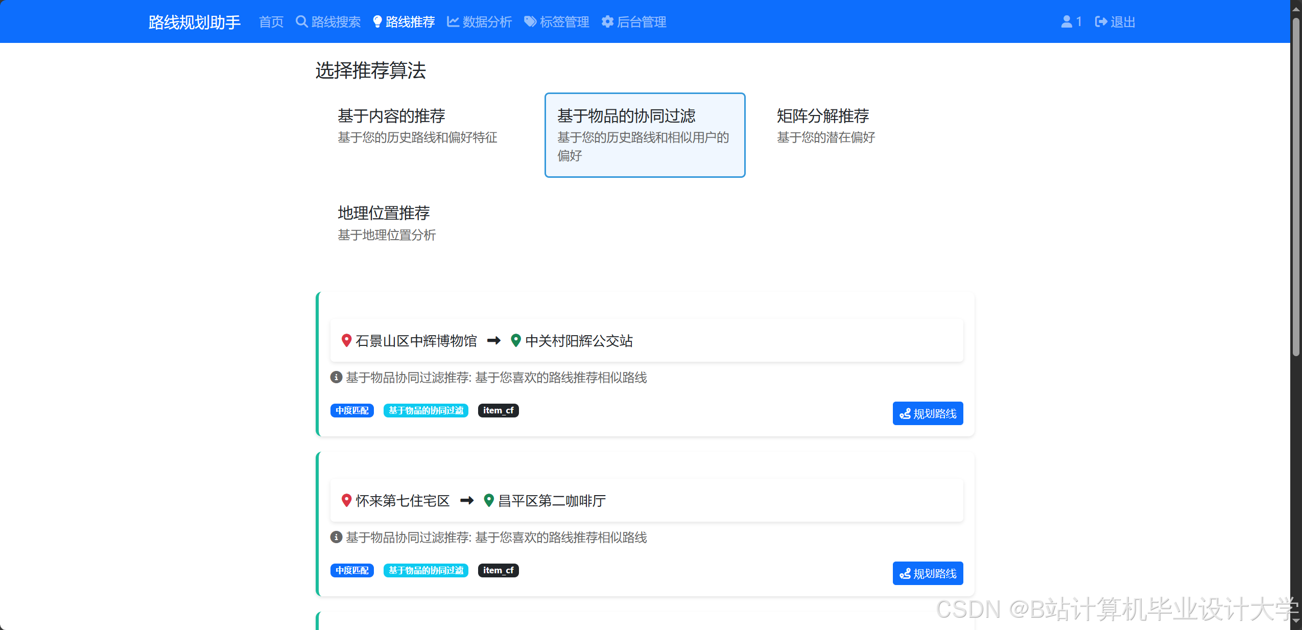 - 基于协同过滤(用户相似度)或内容过滤(路线特征匹配)生成推荐。