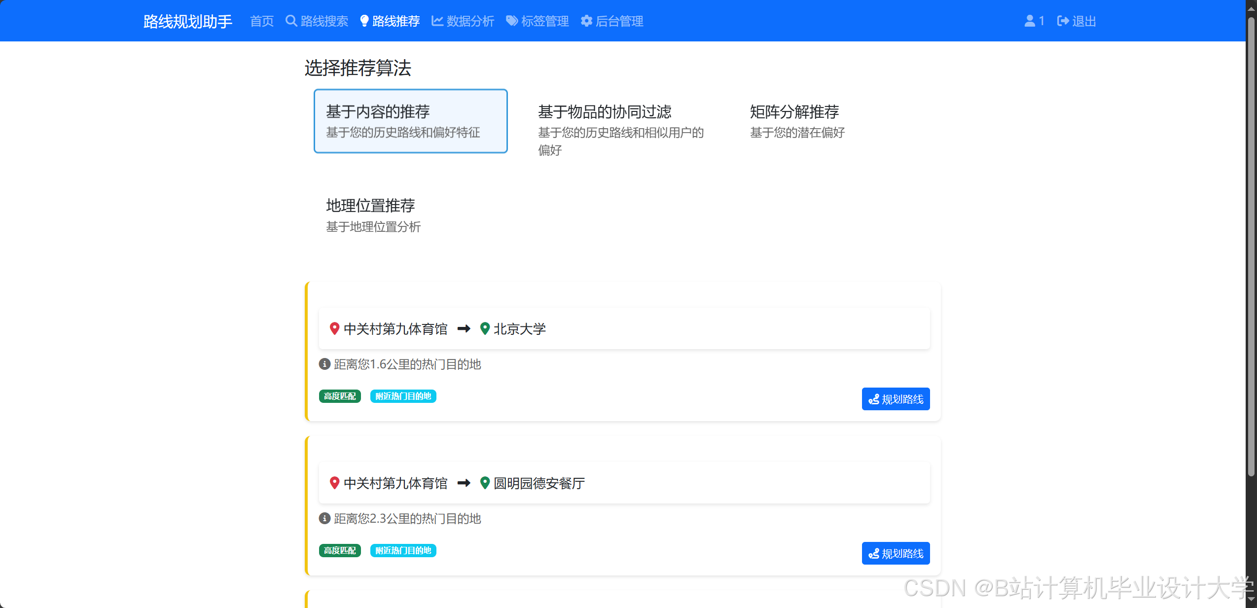 - 协同过滤算法:基于Item的CF计算路线相似度矩阵,推荐与用户历史偏好相似的路线。采用交替最小二乘法(ALS)在Hadoop集群上训练相似度矩阵,推荐准确率(Precision@10)提升15%。