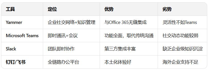 - 企业用户逐渐转向更灵活的Microsoft Teams(2017年推出),Yammer的“社交动态”功能被Teams取代。