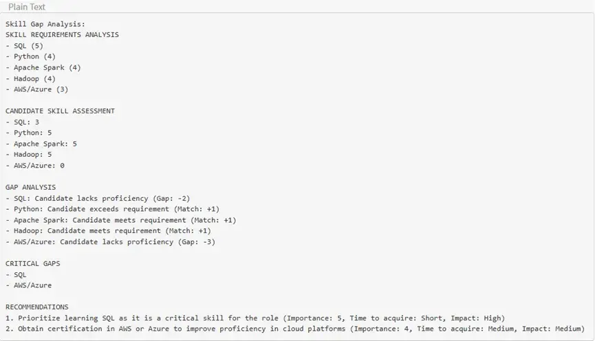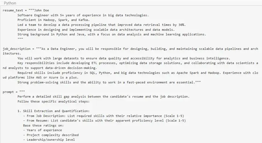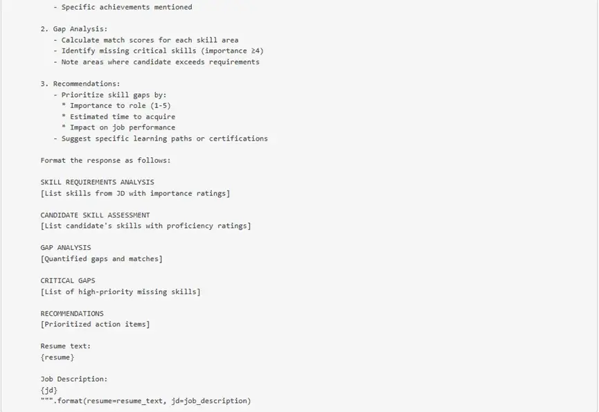 技能差距分析:所定义的提示将以简历输入和职位描述输入为依据,以了解技能差距,并为你给出一个分数,用以说明你的简历与职位描述之间的差距。尽管这可能是一种常规的比较,但对于篇幅较长的简历和职位描述文本,我建议用户尝试使用不同的模型(具备更强推理能力的)和不同的温度参数设置,以获得预期的输出结果。