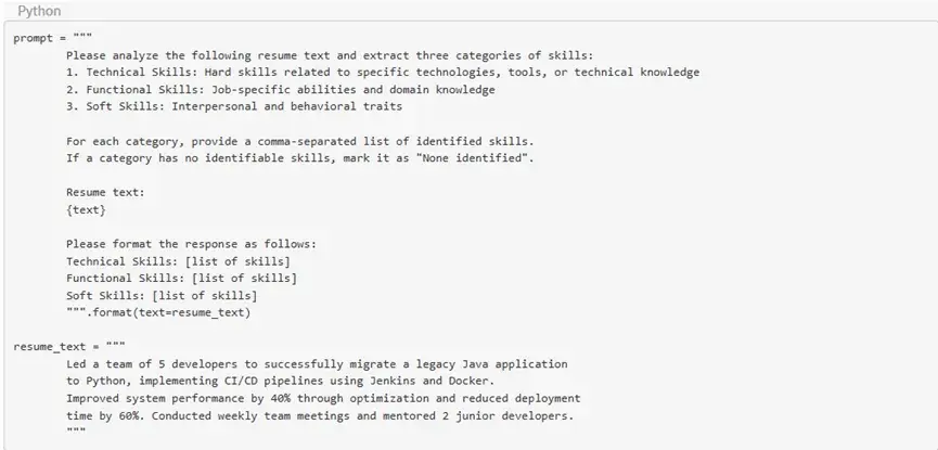 技能提取:所定义的提示词(如下)将识别技术技能、职能技能和软技能——这是我以前在简历中难以清晰表述的内容。输入文本可以是一份简历,甚至可以是他们期望候选人具备的职位描述。这可能也会帮助招聘人员(如果他们想使用这类提示词的话)更轻松地对技能进行分类查看