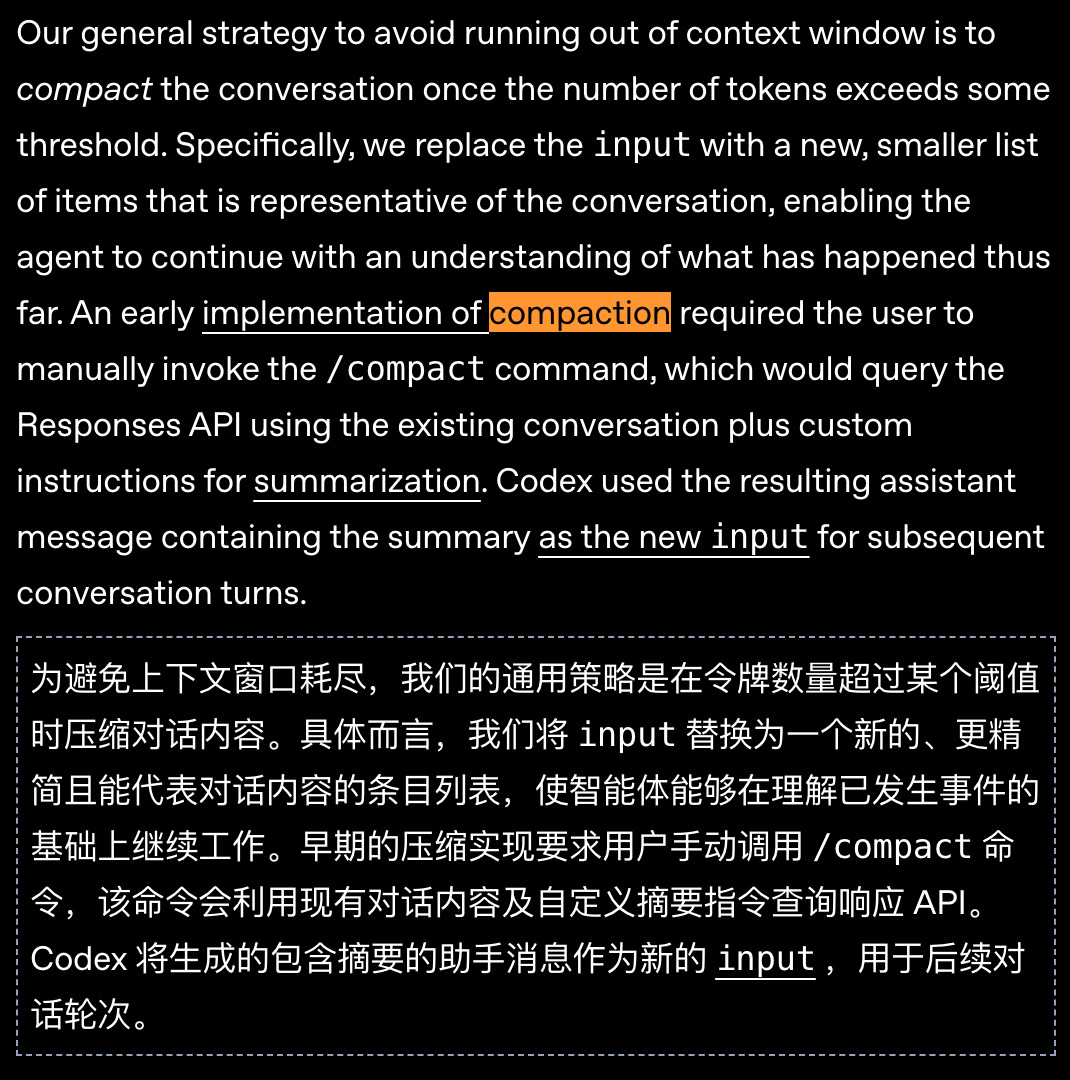 当Token数超过阈值,Codex不会简单地「删除旧消息」,而是会调用一个特殊的/responses/compact接口,把对话历史「压缩」成一个更短的摘要。