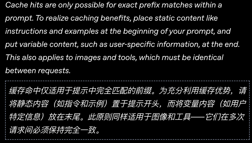 但这里有个坑:任何改变Prompt前缀的操作都会导致缓存失效。比如: