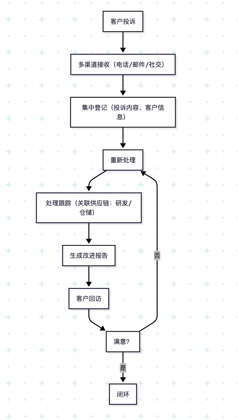 graph TD A[客户投诉] --> B[多渠道接收(电话/邮件/社交)] B --> C[集中登记(投诉内容、客户信息)] C --> D[分配处理(按类型给对应部门)] D --> E[处理跟踪(关联供应链:研发/仓储)] E --> F[生成改进报告] F --> G[客户回访] G --> H[满意?] H -->|是| I[闭环] H -->|否| D[重新处理]