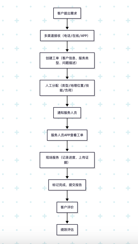 graph TD A[客户提出需求] --> B[多渠道接收(电话/在线/APP)] B --> C[创建工单(客户信息、服务类型、问题描述)] C --> D[人工分配(类型/地理位置/技能/负荷)] D --> E[通知服务人员] E --> F[服务人员APP查看工单] F --> G[现场服务(记录进度、上传证据)] G --> H[标记完成,提交报告] H --> I[客户评价] I --> J[绩效评估]