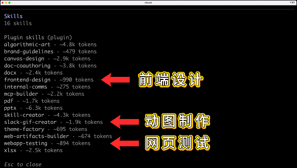 这个 example-skills 包含了一堆官方示例技能,包括前端设计、网页测试、动图制作等等。