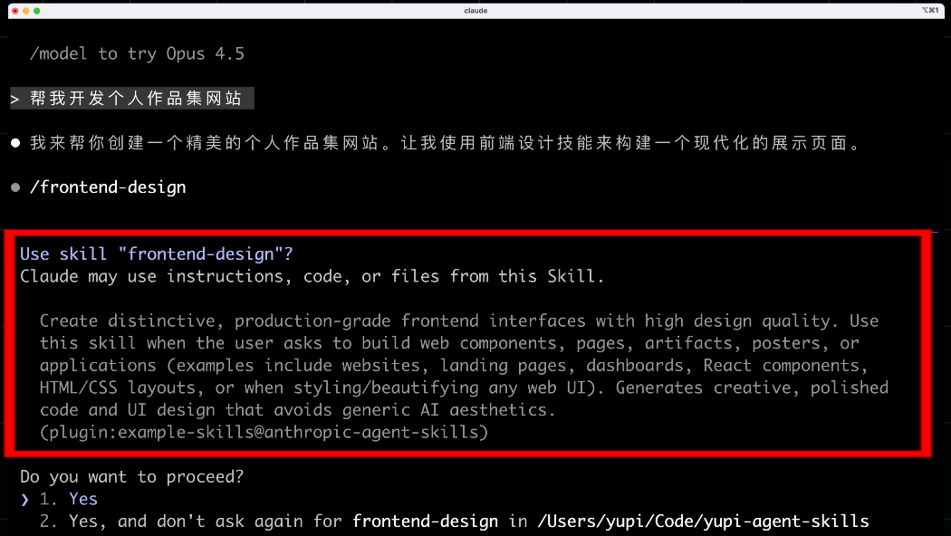 接下来,当你让 AI 开发一个网站时,可以使用斜杠命令手动触发技能,或者让 AI 自动识别技能。