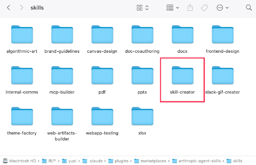 在前面安装的 example-skills 官方示例技能包里,有一个叫 Skill Creator 的技能,专门用来帮你创建新技能。