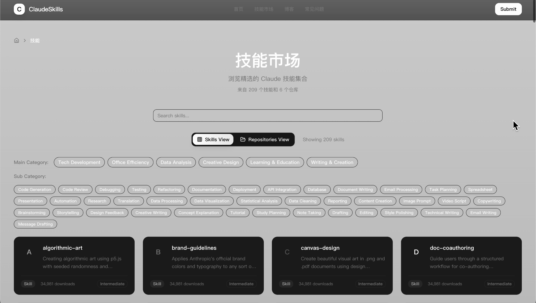 Skills 的社区也非常活跃,你可以在 Claude Skills Hub 市场、开源的 Awesome Claude Skills 等地方找到很多现成的技能。