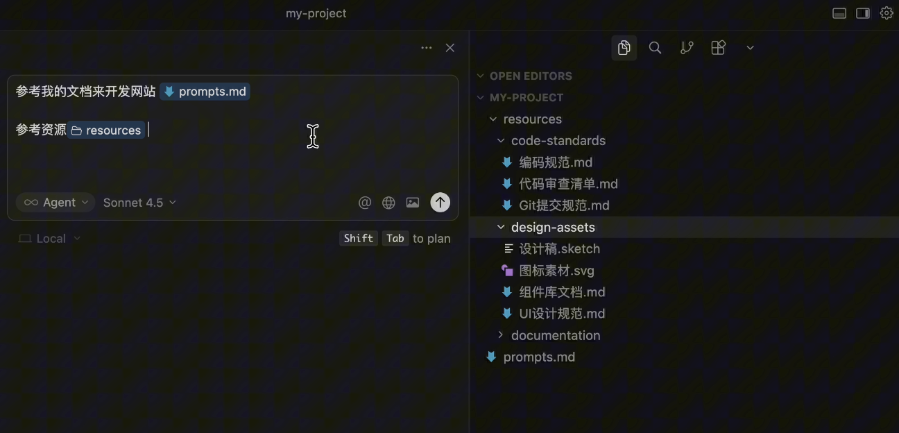 然后创建了资源文件夹,把公司的代码规范、设计素材都塞进去,告诉 AI 参考这些写。