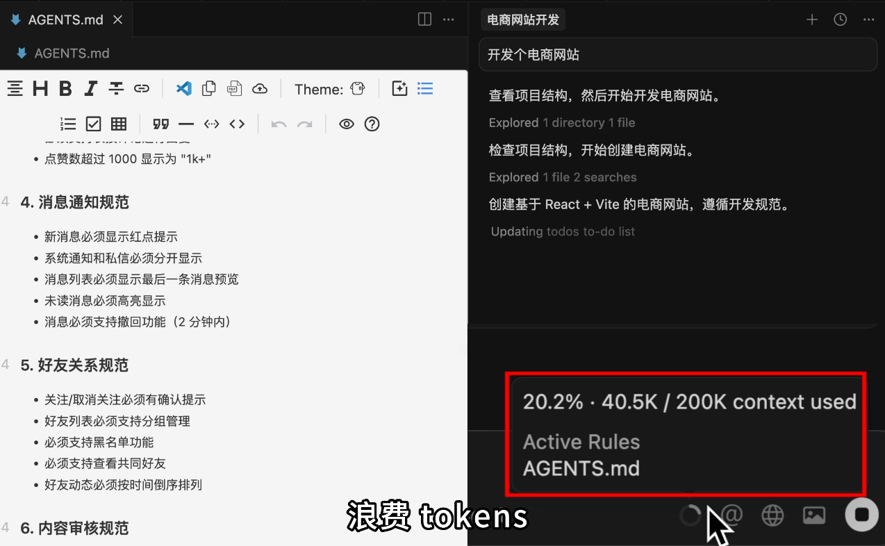 但很快,你发现了问题,随着规范越写越多,文档越来越臃肿,每次对话都要占用很多 AI 上下文空间,浪费 tokens。