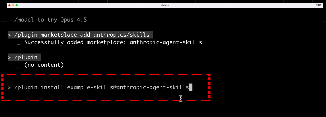 在 Claude Code 中输入命令,安装官方提供的技能包: