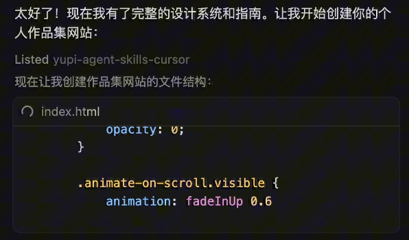 确认之后,AI 会利用技能生成代码,告别蓝紫渐变,生成独特风格的精美页面。