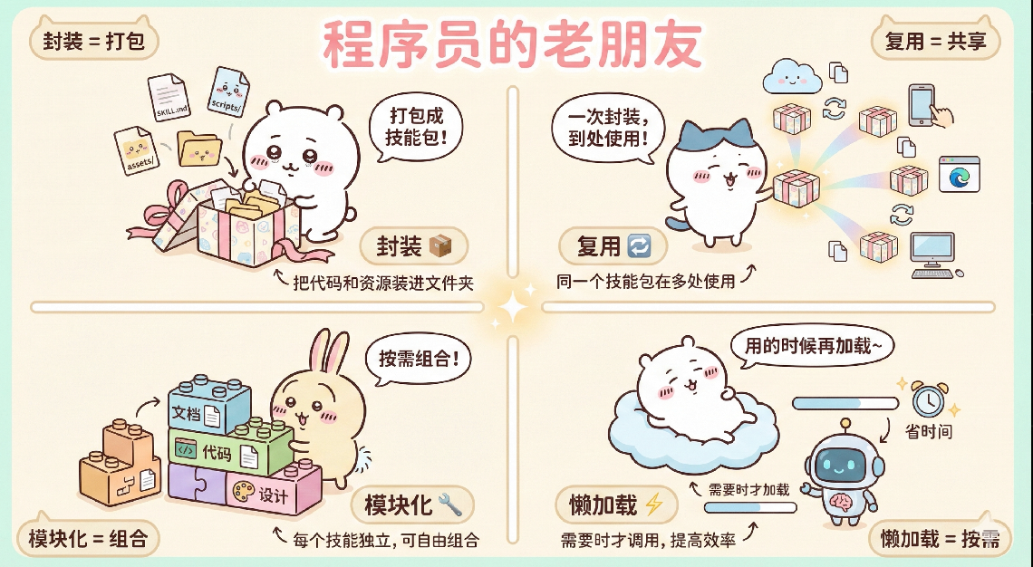 你看着技能文件夹的结构,突然怪叫一声:等等,俺突然意识到一个问题…… 这不就是我们程序员玩烂的 “封装、复用、模块化、懒加载” 那一套吗?