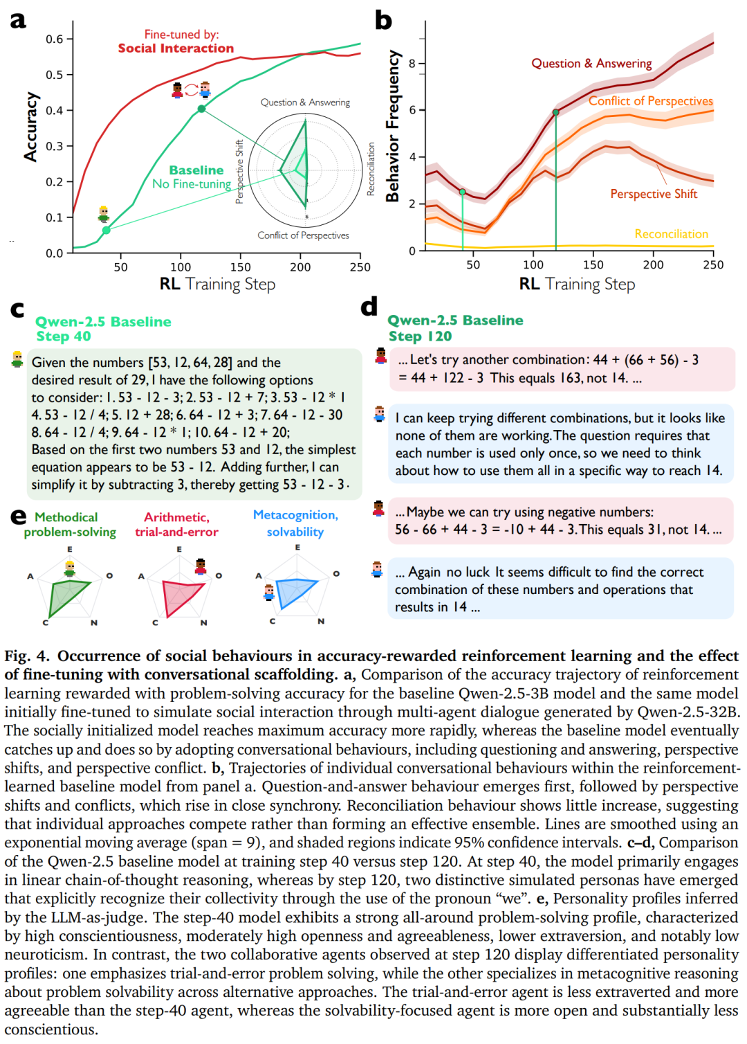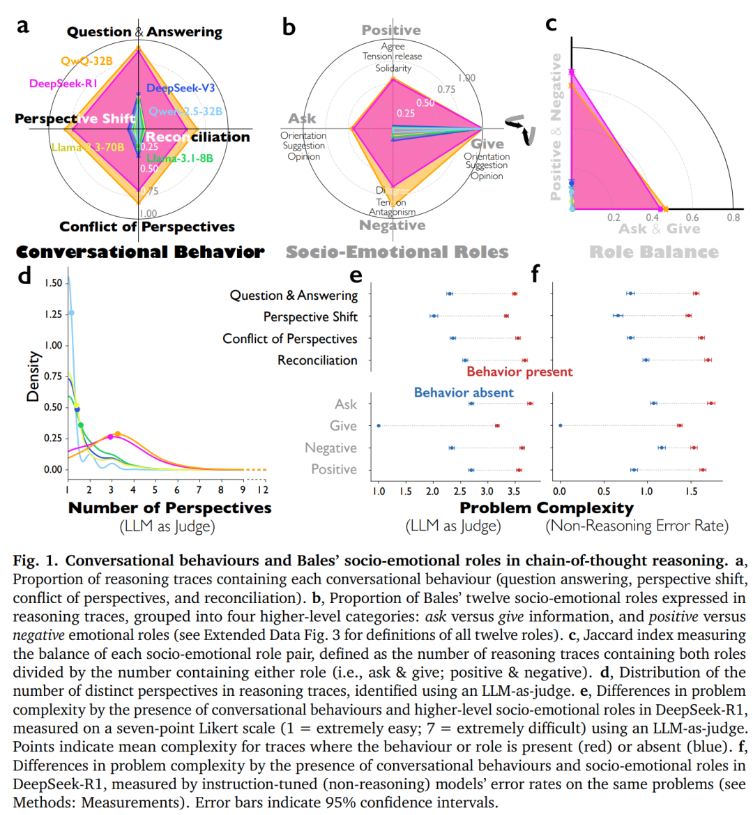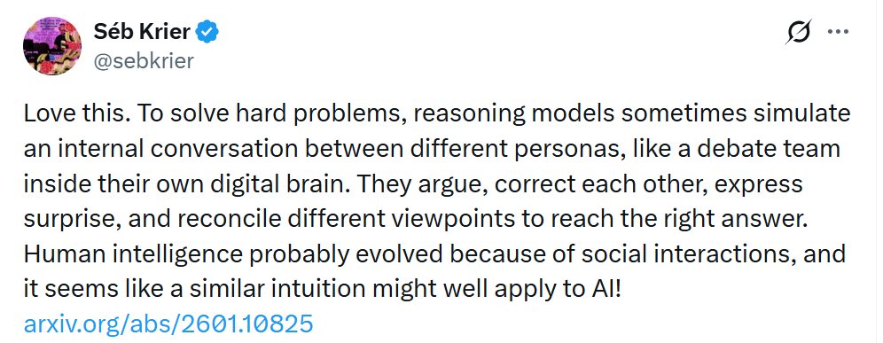 简单理解就是,这项研究发现,为了解决难题,推理模型有时会模拟不同角色之间的内部对话,就像他们数字大脑中的辩论队一样。他们争论、纠正对方、表达惊讶,并调和不同观点以达成正确答案。人类智能很可能是因为社交互动而进化的,而类似的直觉似乎也适用于人工智能!