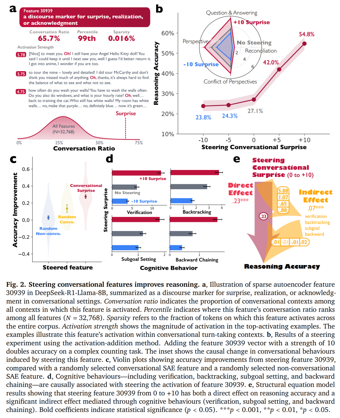 综合来看,这些发现表明:对话特征通过两条路径提升推理能力:一方面,它们直接帮助模型更有效地探索解空间;另一方面,它们通过脚手架式地支持验证、回溯和子目标分解等认知策略,推动系统性的问题求解过程。