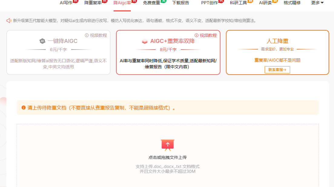 ✅ AIGC降重:低价高效,适合常规优化需求;✅ 双擎降重:强效改写,应对严苛查重标准。