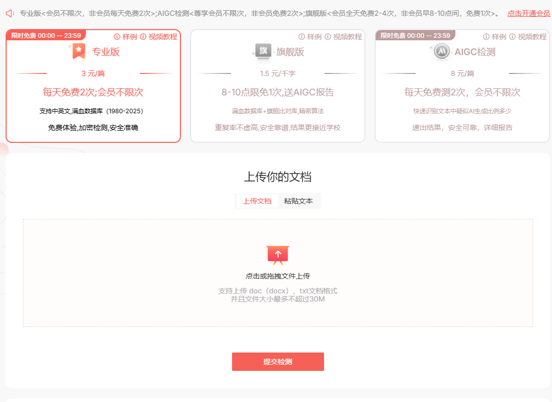 亮点:每日可享1篇免费查重权益,支持中英文检测,附赠AIGC内容识别功能。